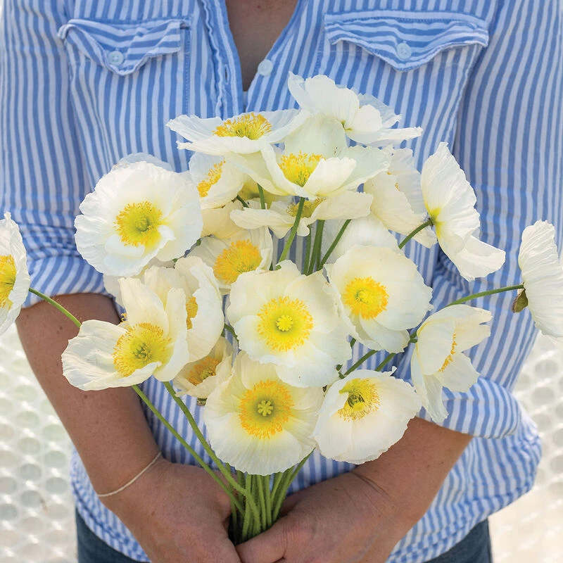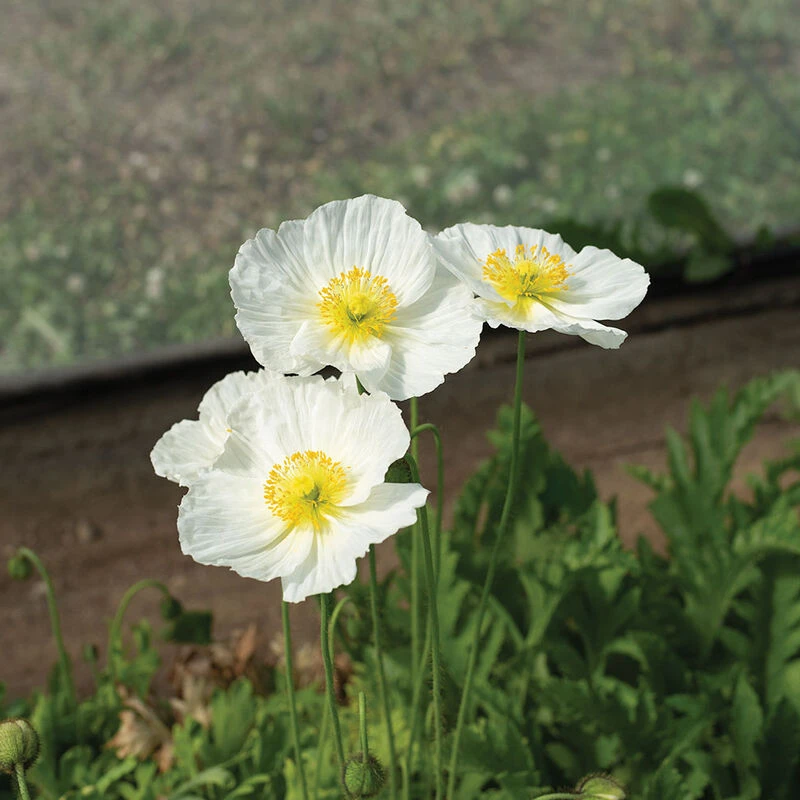 Snow-white, 3–5″ blooms are borne on sturdy, straight, 12–20″ stems. Productive plants produce uniform, crinkled, cup-shaped blooms that sparkle and float above clumps of soft, gray-green foliage. Lightly fragrant.