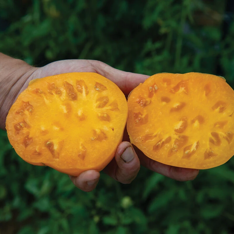 Yellow to golden fruits with meatier flavor and fewer blemishes than others in its class. Larger and more oblate than Valencia at 10–16 oz. Compared to Yellow Brandywine, which it replaces, it produces notably earlier, heavier yields on stronger plants. Indeterminate. USDA Certified Organic.