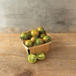 A favorite for chefs and growers for its tangy flavor, firm texture, and extraordinary shelf life. A crispy-ripe tomato with tremendous culinary potential, Green Bee has appeared on menus in the San Francisco Bay Area in a variety of dishes. Very firm texture is ideal for grilling and roasting, but Green Bee can also be used for pickling, gazpacho, salsa fresca… you name it! A great choice for eaters who do not typically like fresh tomatoes, as the “tomatoey” flavors are muted in this variety. When left on the vine, it can even develop hints of stone fruit flavor. Fruits avg. 25–30 gm. Best picked when skin develops a clear yellow-orange hue, or later, because fruit can hold for a long time on the vine without cracking or softening. Can be stored for a few weeks at room temperature or 2–3 months at 55°. Bred by Dr. Fred Hempel of Artisan Seeds. Indeterminate.