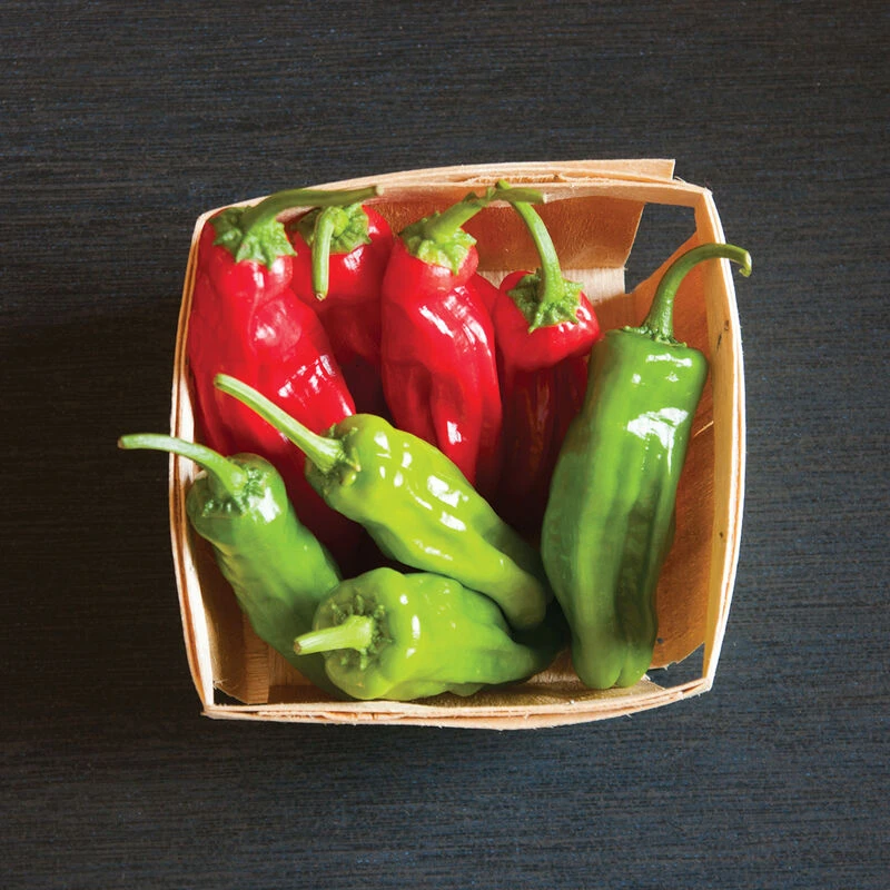 Avg. 3 1/2-4″ heavily wrinkled fruits are thin walled, mild (no heat) when green and slightly sweet when red. Popular in Japan where its thin walls make it particularly suitable for tempura. Also very good roasted, in stir fries, or sautés. In Asia, fruits are always cooked green but they also may be used red. Thinly sliced, the red fruits are excellent in salads and coleslaw. Large, upright plants produce good yields over an extended harvest period.
