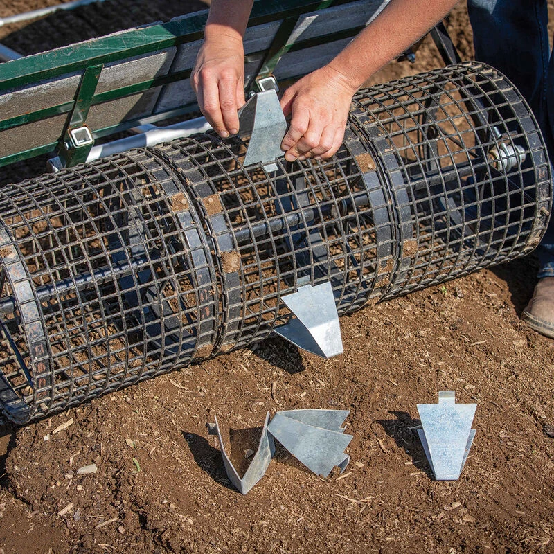 Available in three sizes and easily interchangeable, allowing many combinations of plant spacings. Makes up to 2″ transplanting holes. The seedbed roller’s 1″ mesh and 36″ circumference make dibble arrangement simple and intuitive. No special tools required; just squeeze, and they snap right in, securely gripping the coated trap wire mesh from both inside and out. Change-out for new setups is fast and easy. They work as well through plastic mulch as they do in open soil (sometimes better due to moisture level). Made from galvanized plate steel for corrosion resistance (some edge rust is normal). Made in USA. NOTES: 1.) Always pull roller when using dibbles. 2.) Additional weight is needed to achieve correct dibble spacing and to penetrate plastic mulch.