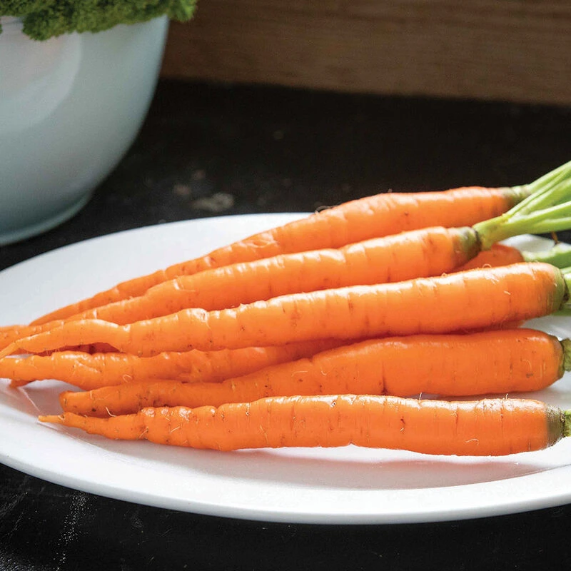 Dark orange, tapered roots are sweet and tender, smooth, and a uniform 9–10″ long. High in beta-carotene, an antioxidant and important source of provitamin A. Strong, medium-tall tops. Imperator type.
